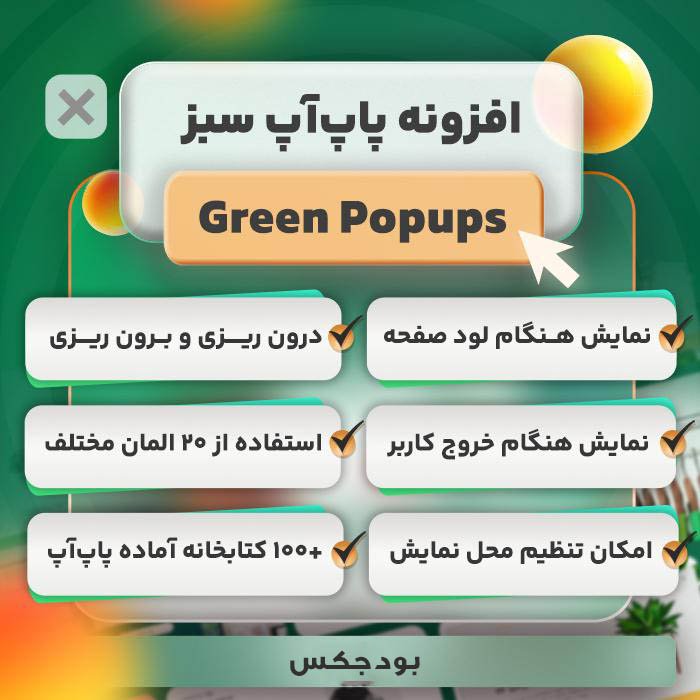 Green Popups با رابط کاربری ساده و در عین حال حرفهای، مناسب استفاده در انواع وبسایتهای شرکتی، فروشگاهی، آموزشی و وبلاگها است.